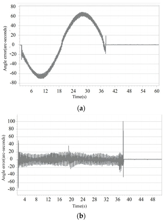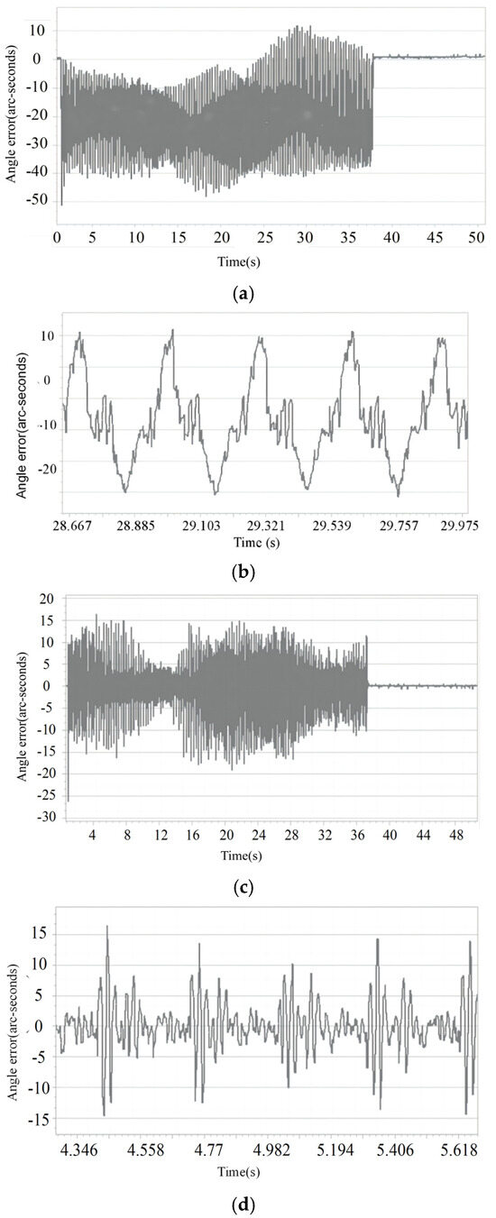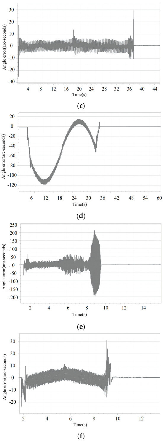 Figure 9c shows the current-loop ADRC waveform under the condition of low speed and a 5 kg load. Compared with the closed-loop control strategy of an output bearing position of the harmonic reducer, the control accuracy is further improved. In the uniform motion of the motor at 200 rpm, although the error at the 180-degree position is larger, the remaining error fluctuation is controlled in the range of plus or minus 8 arcseconds, and the error of starting and stopping is also significantly reduced, controlled in the range of plus or minus 30 arcseconds. Figure 9d shows the precision error waveform of the PMSM output bearing position closed-loop control under the condition of high speed and a 5 kg load. The accuracy error range under this condition is very large, with fluctuations ranging from −190 arcseconds to +18 arcseconds.