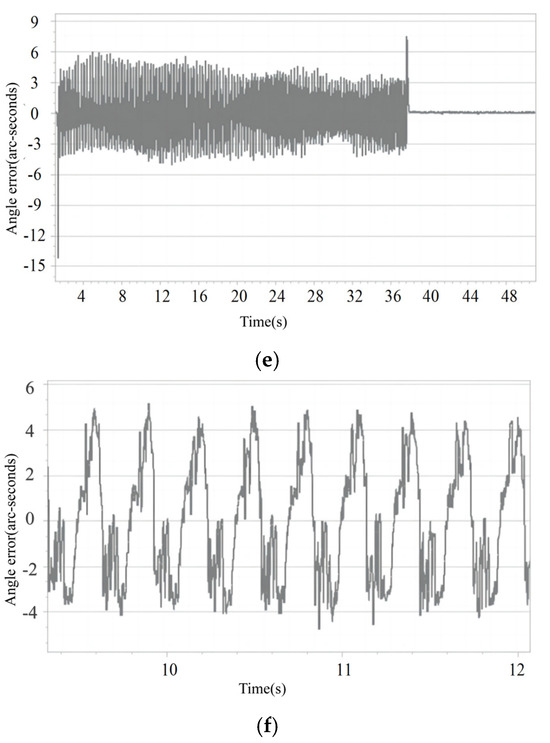 Figure 8c adopts the closed-loop control of the bearing position of the output harmonic reducer, i.e., participates in the vector control operation, while it is only used to calculate the control error. This strategy has good control precision in no-load. Figure 8d is a local enlargement of Figure 8c. It can be seen from Figure 8c that the control accuracy is significantly improved, compared with the strategy of position ring acting on PMSM bearings. The dynamic gear meshing deformation error of the joint module is plus or minus 15 arcseconds. Figure 8e shows the waveform of current loop ADRC, and Figure 8f shows the magnified local waveform. It can be seen from the waveform diagram that the gear meshing error was significantly improved, and the high precision of plus or minus 6 arcseconds was maintained at the speed of 200 rpm, thus breaking the accuracy limit of the reducer itself.