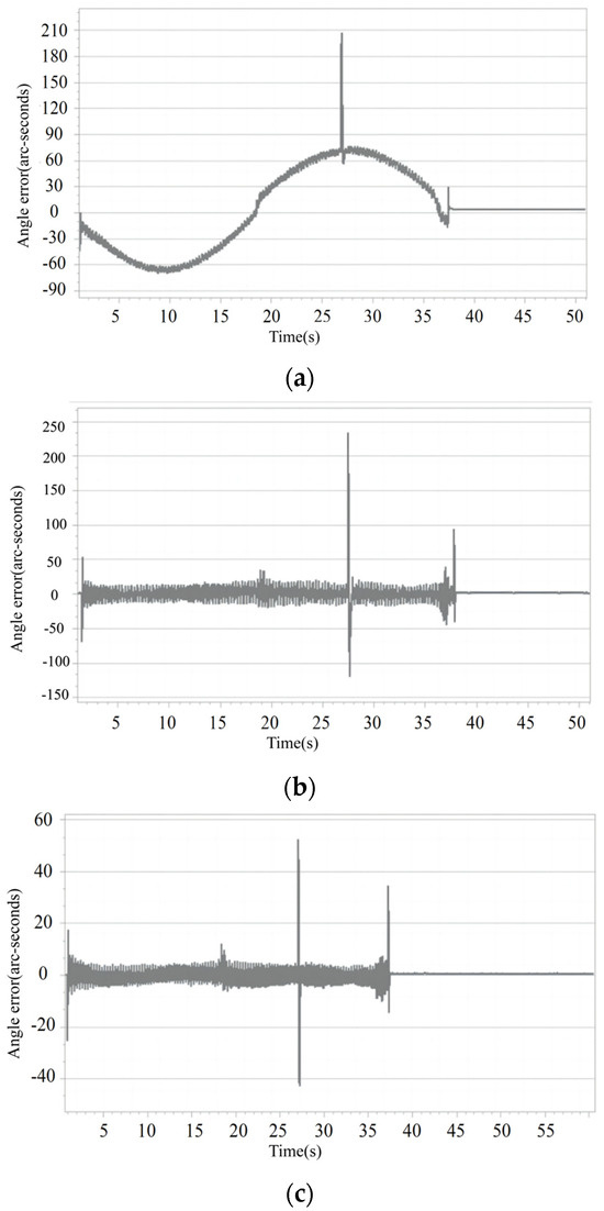When the PMSM moves at a constant speed of 200 rpm, a torque disturbance of a 2 kg load is added to the end of the swinging arm of the robot joint, and the variation waveform of the joint accuracy error is obtained, as shown in Figure 10a–c. The accuracy error of PMSM output bearing position closed-loop control and harmonic reducer output bearing position closed-loop control are more than 200 arcseconds. However, the ADRC algorithm has an obvious suppression effect on the sudden load disturbance, and the accuracy error can be controlled between plus or minus 50 arcseconds.