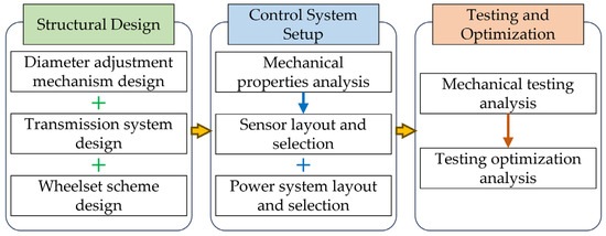 This study developed the mechanical structure of a pipeline robot walking device based on the following hypotheses: adaptation to changes in the internal diameter of the pipeline, accommodation of various pipeline shapes, and the ability to achieve multiple movement modes. To address these research hypotheses, the proposed development process is illustrated in the Figure 1 below.