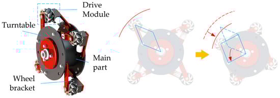 The MWD structure introduced in this research is illustrated in Figure 2 and is primarily composed of the main part, turntable, wheel bracket, and drive module. The main part, turntable, and wheel bracket collectively constitute a diameter adjustment mechanism, wherein the turntable is capable of rotating around the main part, thereby facilitating the adjustment of the outer diameter of the WMD. The diameter adjustment mechanism proposed herein incorporates a laterally arranged scissor-hinge configuration, which demonstrates a significant reduction in longitudinal length when compared to the scissor-hinge structures referenced in the literature review.