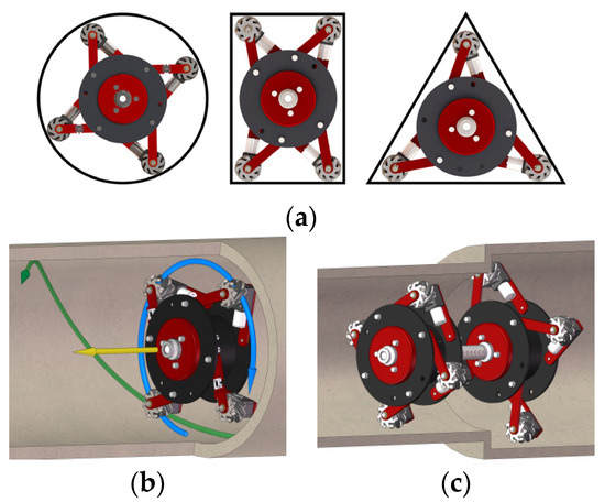 - Abidin, A.S.Z.; Pauzi, M.F.A.M.; Sadini, M.M.; Zaini, M.H.; Chie, S.C.; Mohammadan, S.; Jamali, A.; Muslimen, R.; Ashari, M.F.; Jamaludin, M.S. Development of track wheel for in-pipe robot application. Procedia Comput. Sci. 2015, 76, 500–505. [Google Scholar] [CrossRef][Green Version]