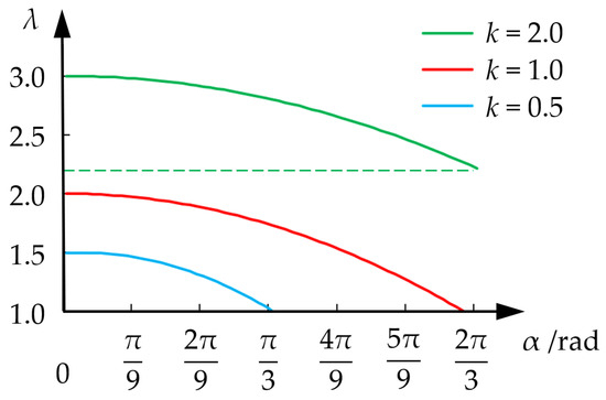 Taking into account the impact of variable diameter ratio parameters, it is possible to attain a more extensive range of variation within a specific range of turntable phase angles. When the ratio is set at k = 1.0, the variable diameter ratio (λ) is observed to range from 1.0 to 2.0, while the phase angle of the turntable (α) varies from 0 to 2.02 rad.