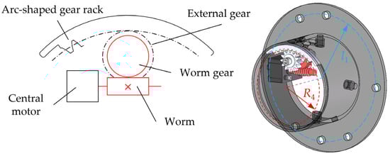 Design and mechanical analyses of the transmission system for the variable diameter module of the WMD were conducted. The schematic of the transmission system is illustrated in Figure 6. Power for the diameter adjustment is supplied by a central motor, which drives the turntable’s rotation through a combination of a worm gear, worm, gear, and an arc-shaped gear rack, thereby facilitating the adjustment of the WMD’s outer diameter.