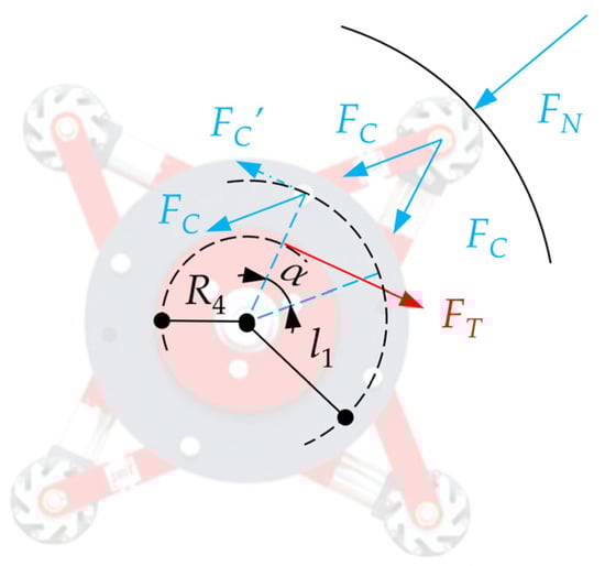 In order to effectively design the driving torque of the transmission system, a driving torque model for the WMD under external forces was developed. A schematic diagram illustrating the mechanical analysis is presented in Figure 7. When the force exerted on the wheel by the inner wall of the pipeline is denoted as FN, the force acting on the wheel bracket is represented as FC. By decomposing the force transmitted to the turntable, derive the resistance in the tangential direction, denoted as FC′. When the variable diameter module remains stable, the driving torque TM of the transmission system is equivalent to the torque generated by the four tangential direction resistances. The relationship between force FN and torque is established as shown in Equation (3).