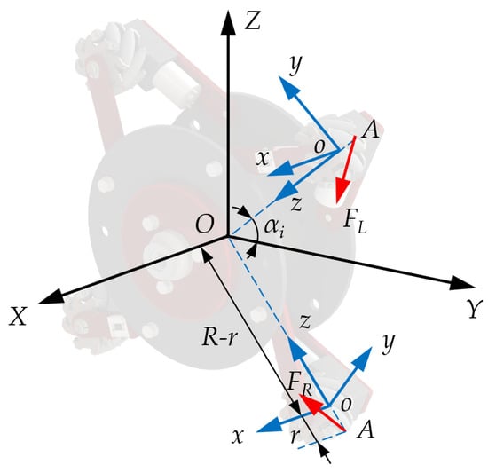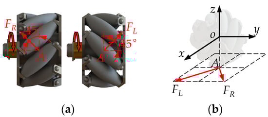 To enhance the diversity of motion modes for the MWD, a Mecanum wheel was selected as the primary component for wheeled locomotion [32]. A Mecanum wheel is fundamentally composed of a central wheel and multiple passive rollers that are uniformly arranged at oblique angles around its perimeter [33]. When the Mecanum wheel is in motion, the angle formed between the frictional force exerted by the passive rollers and the axis of the central wheel is 0.25π rad, as illustrated in Figure 8a. The mechanical properties of the wheels were modeled and analyzed using vector analysis [34]. The centroid of the Mecanum wheel was designated as the origin of the coordinate system, with the x-axis aligned with the direction of the wheel’s axis, the z-axis oriented perpendicular to the ground, and the y-axis established orthogonally to both the x-axis and z-axis in accordance with the right-hand rule. Point A is defined as the contact point between the Mecanum wheel and the ground, as illustrated in Figure 8b.