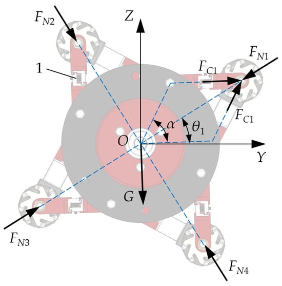 When the WMD performs rotational or helical motion within a circular pipeline, the positions of the four walking wheels continuously change in a periodic manner. Due to the influence of gravity, the support force on the lower walking wheel is not consistent with that on the upper walking wheel; specifically, the force exerted on the lower walking wheel consistently exceeds that of the upper wheel. This discrepancy leads to periodic changes in the forces acting on the wheel brackets, and the resulting instability complicates the establishment of thresholds. To clarify the fluctuation patterns of the forces in the wheel brackets, a mechanical analysis of the WMD’s motion was conducted, as illustrated in the following Equation: