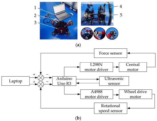 Test environment and control system: (a) test apparatus; (b) control system block diagram. Note: (1) laptop; (2) mobile phone controller; (3) MWD; (4) annular obstacle; (5) pipeline; (6) ultrasonic velocity measurement module; (7) force sensor module; (8) rotational speed sensor module.