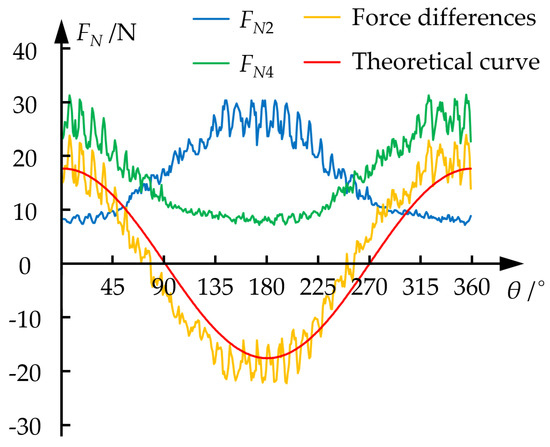 In order to assess the force fluctuations occurring between the walking wheel and the inner wall of the pipeline during movement, the MWD was configured to rotational mode, as detailed in Table 3. Force fluctuations and the discrepancies between FN2 and FN4 were measured utilizing a force sensor. The data obtained from these force measurements facilitated the construction of a fluctuation curve. The theoretical differences between FN2 and FN4 were subsequently computed using Equation (10). The final results are illustrated in Figure 12. The force sensor employed in this study was the ZNLBS-XII model, which possesses a capacity of 100 N and an accuracy of 0.03%.