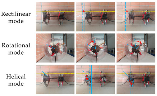 To validate the optimization outcomes, a verification test was performed on the optimized device, which involved conducting five measurements of the slip rate to derive an average value. The results indicated that when the RS was set at 70 rpm and the PF at 30 N, the slip rate was recorded as 11.6 ± 1.5%. The findings from the passability verification test demonstrated that the MWD was capable of achieving smooth passage at OH of 5 mm and 10 mm. At an OH of 15 mm, one instance of barely passage was noted, while the remaining trials resulted in smooth passages. Furthermore, the motion mode of the MWD was assessed by adjusting the rotary direction of various wheelsets in accordance with Table 3, leading to the acquisition of predicted results, which are illustrated in the subsequent Figure 13.