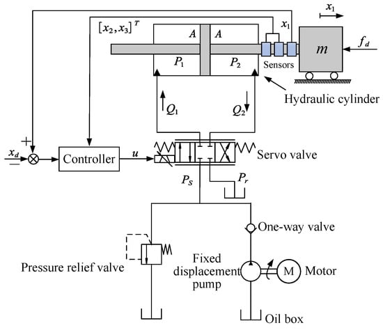 As a complex nonlinear mechatronic system, an electro-hydraulic servo system (EHSS) possesses many prominent merits such as fast response, strong load capacity, high power-to-weight ratio and so on [1,2,3]. Because of these advantages, EHSSs have been extensively used in modern industrial applications, such as digging robots [4,5,6], hydraulic press [7,8], mechanical arms [9,10], etc. Nevertheless, the EHSS in practical applications always suffers from various uncertainties. On one hand, the model parameters such as load mass, effective oil bulk modulus and leakage coefficient may significantly change with working conditions, temperature and equipment wear. On the other hand, the hydraulic system has strong nonlinearities in the flow and pressure dynamics of the control valve, oil compressibility and leakage. Furthermore, owing to the intricacy of the working environment, the EHSS is inevitably susceptible to unknown external load forces and disturbances. All these uncertainties could seriously deteriorate the system control performance, or even destroy the system. Therefore, the high-precision tracking control of an EHSS in the presence of uncertainties with advanced control methods still poses challenges for engineers.
