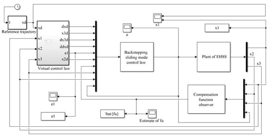The simulations are conducted on a MATLAB/Simulink platform. As shown in Figure 3, the simulation model is composed of are four components, i.e., the plant of EHSS, compensation function observer (CFO), virtual control law (VCL) and backstepping sliding-mode control law (BSMC). The plant of EHSS, CFO and BSMC are modeled using S-Function, while VCL is built using the MATLAB Function. The physical parameters of the EHSS used in the simulation model are listed in Table 1, and the system parameters such as the coefficient of the viscous friction force B and leakage coefficient of the system are assumed to be perturbed, which result in the uncertain parts and in (6) as and . The system sample time is taken as s.