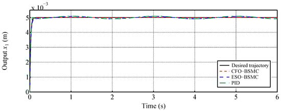 In this case, the desired trajectory is selected as an exponential signal whose initial state is zero and steady state is 0.005 m, i.e., m, and a time-varying sinusoidal external disturbance N is imposed to the EHSS.