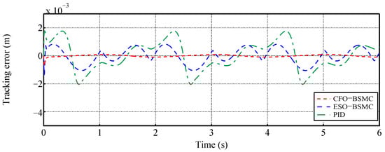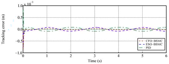 The obtained comparison results of the performance indices under the three controllers are presented in Table 2. It is clearly seen that all the indices of the proposed CFO-BSMC are the smallest among the three controllers. More specifically, compared with PID and ESO-BSMC, the mean absolute error of the proposed CFO-BSMC is increased by and , and the the root mean square error is improved by and , respectively. These results verify that the proposed control approach achieves the best tracking accuracy. In addition, the integrated time absolute error is to weigh the tracking error by time, which represents the system insensitivity to initial error and sensitivity to the steady error. Obviously, the of the proposed controller is the smallest, which means the proposed controller performs the best robustness against external disturbances.