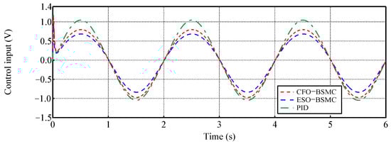 The output tracking performance of the three controllers is presented in Figure 8. As can be seen, the three controllers are able to drive the output of the EHSS close to the desired trajectory. Furthermore, a comparative result of tracking errors is shown in Figure 9, which indicates that the proposed CFO-BSMC has the smallest tracking error, followed by ESO-BSMC, and the worst is the PID, which means the proposed controller achieves the best transient and steady-state tracking performance. Moreover, by comparing the estimation performances between CFO and ESO in Figure 10, it is evident that the ESO presents a phase lag in estimating the disturbance, while the proposed CFO can estimate the disturbance accurately. The smooth, continuous and bounded control signals are shown in Figure 11.