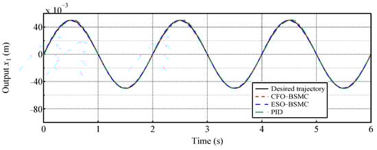 As seen from Figure 4, the proposed controller achieves superior tracking control performance over the other two controllers in the presence of parameter perturbations and time-varying sinusoidal disturbance. Specifically, by comparing the tracking error curves in Figure 5 during the transient and steady stages, it is evident that the tracking error of the PID controller fluctuates more seriously than that of CFO-BSMC. The reason for this is that the lumped disturbance can be estimated and compensated by both ESO and CFO. Furthermore, by examining the estimation curves of ESO and CFO in Figure 6, it is apparent that CFO obtains a higher estimation accuracy than ESO under the same bandwidth. Figure 7 exhibits that the control signals of the three controllers are smooth, continuous and bounded. This group of simulation results demonstrates the effectiveness and superiority of the proposed controller.