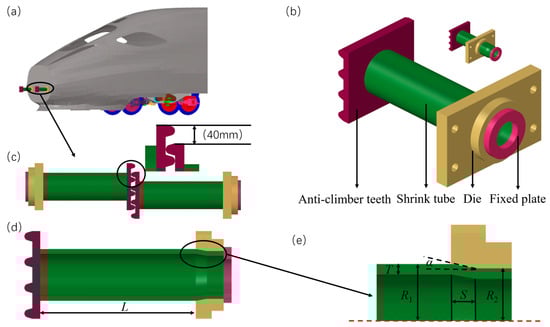 In the energy absorption structure on the train, anti-climbing devices are installed in pairs at the front end, as shown in Figure 1a, to prevent the phenomenon of climbing in a collision accident. The action process of the shrink tube anti-climb device is that when a collision accident occurs between trains, the anti-climb teeth bear the impact and push the shrinkable tube into the inside of the contractile mold. The shrink tube is deformed by the extrusion of the conical surface of the contractile mold, and its outer surface has friction with the inner surface of the contractile mold. Through radial contractile plastic deformation and friction, the impact energy is absorbed to reduce the impact on other train structures and occupants.