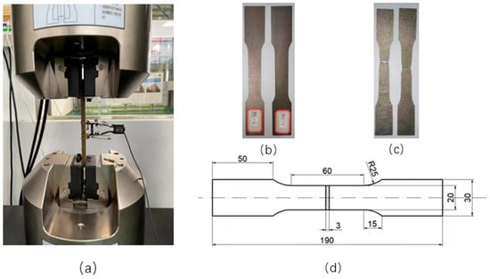 Material properties: (a) test equipment, (b) the sample before test, (c) the sample after test, and (d) material specimen size.