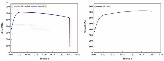 The engineering stress–strain curve of 45 steel is shown in Figure 3a, which was obtained by using an extensometer as indicated in Figure 2a. The true stress–strain curve correspondence is described by the following formula: