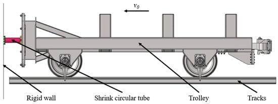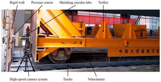 The low-speed crash test is a common method used to verify the energy-absorbing structure of trains, but the crash test of actual running speed is almost impossible. As for the collision speed, the EN15227 standard [41] only puts forward that the energy absorption structure of the train end can meet the requirements of energy absorption at the running speed of 18 and 36 km/h, and the collision at higher speeds will inevitably lead to car body damage and casualties. To verify the crashworthiness of the shrink tube, the trolley test was carried out in the Key Laboratory of Traffic Safety on Track (Central South University). The schematic diagram of the test scene is shown in Figure 4. The anti-climbing device with shrink tube is fixed in the normal installation position of the trolley to impact the rigid wall at a certain speed after adjusting the counterweight according to the requirements of different energy absorptions. The impact speed of the trolley is obtained using the high-pressure air gun system. At the moment when the car touches the rigid wall, the trigger speedometer below the car can record the impact speed to ensure the accuracy of the impact energy. The pressure sensor records the process of force change during impact. A set of high-speed camera systems is arranged on the right side of the shrink tube to record the deformation process and displacement data of the shrink tube. The frequency of high-speed photography is 3000 Hz, and the frequency of pressure sensor is 500,000 Hz.