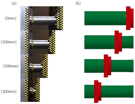 In the crash test, the shrink tube is pressed into the flange of the shrink mold, and the high-speed camera system cannot show the shrinkage deformation process, but it can observe that there is no shock and bending bias load during the compression process. Other parts have no plastic deformation AND no fracture, and the whole energy-absorption structure works well. As shown in Figure 6, the displacement of 0 mm, 100 mm, 200 mm, and 300 mm during the test and simulation are compared, which has a good agreement.