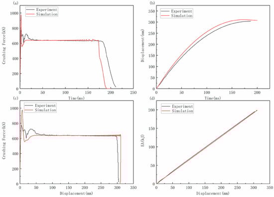 Comparison of test and simulation conditions: (a) force and time curve, (b) displacement and time curve, (c) force and displacement curve, and (d) energy absorption and displacement curve.