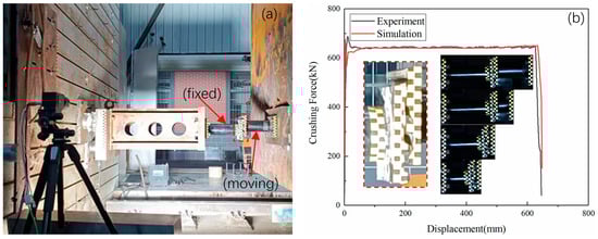 In order to verify the anti-climb capability, the anti-climbing device collision test was carried out in accordance with the requirements of EN15227. According to EN15227, the anti-climbing devices of the two trains in the opposite direction need to mesh together to ensure longitudinal compression and energy absorption so as to avoid the instability of the anti-climbing devices under partial load and the phenomenon of vertical train climbing in the collision accident. The shrink tube energy absorption device was installed on a 27 t test bench and a fixed, rigid wall, respectively, and the anti-climber teeth collision test was carried out to simulate the crawling phenomenon in collision accidents. In the test, the anti-climber teeth of the moving end are 40 mm higher than that of the fixed end, and the impact speed of the vehicle is 5.51 m/s. According to the test conditions, the test scene is arranged as shown in Figure 8a. By obtaining displacement data and impact force data through high-speed photography and pressure sensors, the total absorbed kinetic energy of the anti-climbing device is 409.18 kJ. By integrating the curve of force and displacement, the total deformation is 646.5 mm, and the mean crushing force in the whole collision stroke is 632.92 kN.