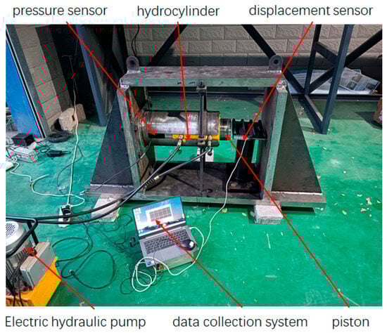 To evaluate the vertical bearing capacity of the shrink tube anti-creep device, a set of test systems is designed. The test system includes tooling frame, pressure sensor, hydraulic cylinder, piston, displacement sensor, and anti-climber device, as shown in Figure 9. The pressure sensor, hydraulic cylinder, and piston are confined in a horizontal cylinder, and the end of the anti-climber device is fixed to the tooling frame base plate. During the test, the piston is driven to the right by the electric hydraulic pump, and the load is applied to the teeth plate of the anti-climb device. The anti-climb teeth plate moves to the right after the force, which drives the overall deformation of the shrink tube. The displacement sensor set on the tooth plate collects real-time displacement data, and the pressure sensor at the back of the cylinder collects real-time load data, which can synthesize displacement and load curves.
