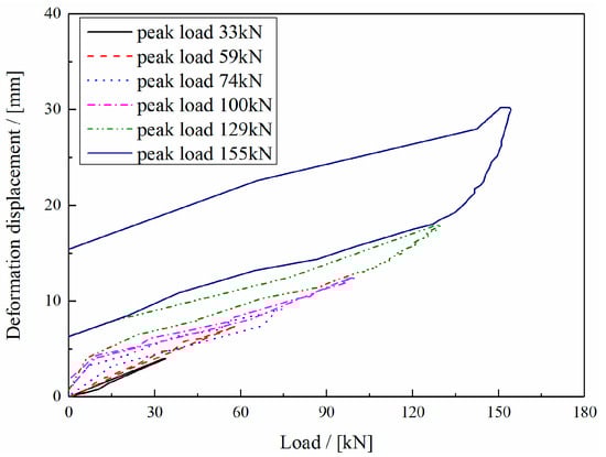 Vertical loading test was carried out on the anti-climb device, and the displacement and force curves during loading and unloading under different peak loads were obtained, as shown in Figure 10. When the peak load is below 100 kN, there is almost no residual deformation. When the peak load is 129 kN, the residual deformation is 6.5 mm, and when the peak load is 155 kN, the residual deformation is 15.5 mm, which meets the technical requirements of vertical load of ≥150 kN.