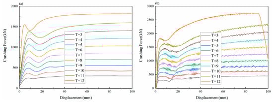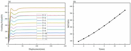 For each curve, the Fmax appears within the displacement of about 10 mm at the initial stage, rapidly decreases, and begins to increase after reaching the minimum value at about 20 mm until it no longer changes after reaching a stable platform force. It is shown in Figure 11a that the thinner the wall thickness, the shorter the gentle phase after the Fmax decline. With the increase in the wall thickness, the displacement to reach the platform force also increases. When the wall thickness is 3 mm, the platform force is 92.5 kN at the displacement of 32 mm, and when the wall thickness is 12 mm, the platform force is formed at the displacement of 55 mm, and the value is 543 kN. Further, it is shown in Figure 11b that there is a close linear relationship between the MCF and the increase in wall thickness. Under this design parameter, every 1 mm increase in the wall thickness increases the MCF by about 45.1 kN.