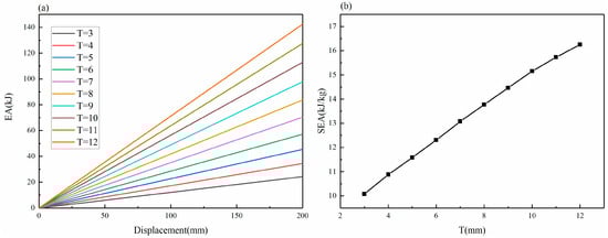 The energy absorption and displacement curves under different wall thicknesses are shown in Figure 12. It shows that with the increase in wall thickness, the energy absorption also increases linearly, and the SEA has a close linear relationship with the increase in wall thickness. Under this design parameter, every 1 mm increase in the wall thickness increases the SEA by about 0.618 kJ/kg.