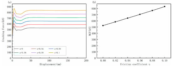 When the wall thickness T = 12 mm and other values are consistent with the above section, the effect of different friction coefficients on the MCF is studied. Friction is mainly related to material properties, surface treatment, and lubrication measures. It mainly occurs on the contact between the outer surface of the shrink tube and the inner surface of the shrink flange. The values of friction coefficients are 0, 0.02, 0.04, 0.06, 0.08 and 0.1, respectively. The force–displacement curves under different friction coefficients are shown in Figure 13a. With the increase in friction coefficient, the shape of the force–displacement curve remains basically the same, but the Fmax and MCF increase uniformly. The Fmax appears in each curve within the displacement of 3–5 mm at the initial stage, maintains a stable value after a slight decline, continues to increase, and increases to a stable force within 45–50 mm. For example, in the case of friction coefficient u = 0.04, the Fmax appears at the displacement of 4.7 mm. For the value of 656 kN, in the displacement range of 10–25 mm, the force value is small and then begins to increase until the displacement reaches 48.6 mm. The stable force reaches 647 kN and then maintains a stable state. Further, it is shown in Figure 13b that the increase in MCF and friction coefficient is close to a linear relationship. Under this design parameter, every 0.02 increase in friction coefficient increases the MCF by about 61 kN.