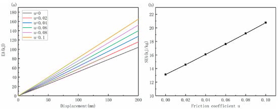 The energy absorption and displacement curves under different friction coefficients are shown in Figure 14a. With the increase in friction coefficient, the energy absorption also increases linearly. It is shown in Figure 14b that the SEA increases linearly with the increase in the friction coefficient. Under the design parameter, the SEA increases by 1.53 kJ/kg with an increase in the friction coefficient by 0.02.