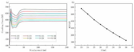 In order to determine the effect of different axial lengths of friction cone S on the MCF, the other dimension parameters are consistent with the preceding section. The axial length of the friction cone S is 23, 24, 25, 26, 27, 28, 29, and 30 mm, respectively. The force–displacement curves under different S of the friction cone are shown in Figure 15a. It shows that the shape of the force–displacement curves remain basically the same with the increase in the axial length S of the friction cone, but the Fmax and MCF decrease successively. The reduction is small. Further, it is shown in Figure 15b that the MCF decreases by 13.5 kN when the axial length S of the friction cone increases by 1 mm, which does not have a linear relationship. The shape of each curve is basically the same as that of curve shapes under the change of the first two parameters. The Fmax appears at the displacement of 4 mm in the initial stage, maintains a stable value after a slight decline, then continues to increase, and then increases to a stable force within 45–50 mm.