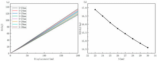 The energy absorption and displacement curves under different axial lengths of the friction cone are shown in Figure 16a. With the increase in the axial length of the friction cone, the energy absorption decreases correspondingly, with a small reduction. At the same time, it is shown in Figure 16b that as the axial length of the friction cone increases, the SEA decreases correspondingly. When S is 23–26 mm, the growth is faster, and when S is 27–30 mm, the growth is slower.