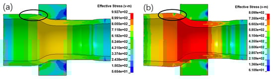 Comparison of deformation modes of tubes with different cone angles; the circles in the figure show different deformation modes. (a) Cone angle of 25°; (b) cone angle of 30°.