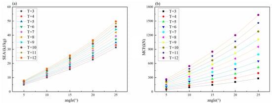 As shown in Figure 20a, the variation trend of SEA of shrink tubes at different cone angles with the thickness of shrink tubes is close to linear growth. From T = 3 mm to T = 12 mm, the increase in SEA of shrink tubes is about 160%. When the cone angle is 5°, the increase is the smallest, 157.26%, and when the cone angle is 15°, the increase is the largest, 161.71%. As shown in Figure 20b, the variation trend of the MCF with the increase in the thickness at different cone angles is close to linear growth. From T = 3 mm to T = 12 mm, the increase rate of the MCF of the shrink tube is more than 570%. When the cone angle is 5°, the increase rate is a minimum of 576%, and when the cone angle is 10°, the increase rate is a maximum of 587%.