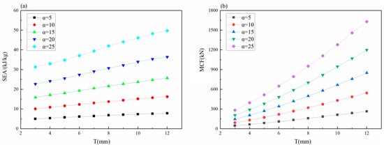 The crashworthiness of the tube with different thicknesses varies with the cone angle: (a) the SEA; (b) the MCF.