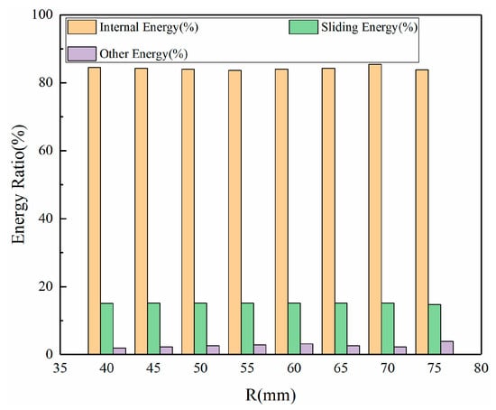 The effect of the radius R1 change on the SEA and MCF is studied while the cone angle and tube wall thickness remain unchanged. When α = 15° and T = 6 mm are kept constant, the SEA changes greatly with the radius, as shown in Figure 21a, while the MCF changes little with the radius, as shown in Figure 21b. With the increase in the radius from 40 mm to 75 mm, the decrease in SEA is first faster and then slower, which decreases faster when the radius increases from 40 mm to 60 mm; the SEA decreases from 33.66 kJ/kg to 21.07 kJ/kg, and the decline is slower when the radius increases from 60 mm to 75 mm. The SEA only decreased from 21.07 kJ/kg to 17.08 kJ/kg. In the process of radius increase, the MCF is always in a relatively stable range, showing only a small fluctuation; the MCF first decreases and then increases. The starting and ending values are 348 kN and 346 kN, respectively, and the minimum value is 339 kN when the radius is 60 mm. This shows that the SEA decreases with the increase in the radius of the shrinkable tube, and the change of radius has little effect on MCF. Similarly, the change of radius has little effect on the absorption energy. The data of various types of energy extracted by LS-DYNA software (12.1) were compared, as shown in Figure 22. Internal energy and sliding energy account for the majority, with internal energy accounting for more than 80%, sliding energy accounting for about 15%, and other energy totals being less than 5%. The energy proportion fluctuates little with the change of the radius.