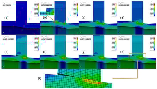 The change process of the contact length of the conical surface in the initial stage of collision: (a) 0 ms; (b) 1 ms; (c) 2 ms; (d) 3 ms; (e) 4 ms; (f) 5 ms; (g) 6 ms; (h) 7 ms; (i) local enlarged view of contact surface.