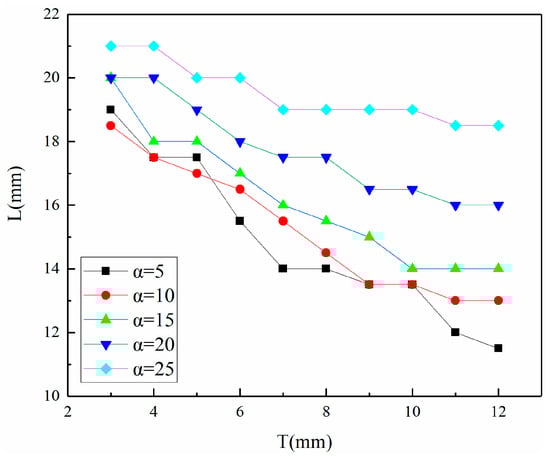 As shown in Figure 24, the stable contact length of the friction cone of the shrinkable tube under different structural parameters decreases with the increase in wall thickness because the overall stiffness of the shrinkable tube increases with the increase in wall thickness. When the cone angle α = 5°, the stable contact length changes the most, from 19 mm to 11.5 mm, and when the cone angle α = 25°, the stable contact length changes the least, from 21 mm to 18.5 mm. In the case of the same thickness, except for the slight deviation when the cone angle α = 5°, the larger the cone angle, the larger the stable contact length, and the larger the change amplitude of the stable contact length with the cone angle. When the wall thickness T = 3 mm, the stable contact length changes the least, increasing from 19 mm to 21 mm with an increase of 10.5%. When T = 6 mm, the stable contact length increases from 15.5 mm to 20 mm, an increase of 29%. When T = 9 mm, the stable contact length increases from 13.5 mm to 19 mm, an increase of 40.7%. When T = 12 mm, the stable contact length changes the most, from 11.5 mm to 18.5 mm, an increase of 60.9%.