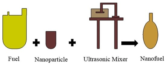 Once the appropriate proportions of fuel and nanoparticles were prepared, they were mixed using an ultrasonic mixer to stabilize the solution and prevent nanoparticle deposition. Figure 2 illustrates the steps for nano-fuel production. Due to the strong Van der Waals forces between nanoparticles, they tend to agglomerate, necessitating stabilization. Instability in nano-fuels can result in clumps of nanoparticles, leading to variations in physical and chemical properties, making it difficult to generalize the findings [37].