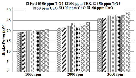 As shown in Figure 4, the brake power increases with the addition of different nanoparticles to the fuel. It can be seen that an increase in the concentration of TiO2 and CuO nanoparticles results in a higher power output. The maximum growth rates of 11.71% and 10.59% were achieved for blends containing 150 ppm CuO and 150 ppm TiO2 fuels at 2000 rpm, respectively. The presence of metal particles in the combustion chamber improves the mixing of fuel and air. Additionally, due to the catalytic properties of Cu and Ti, a higher rate of energy release is observed. This generates more energy in the cylinder and enhances the heat transfer coefficient when nanoparticles are introduced into the fuel.