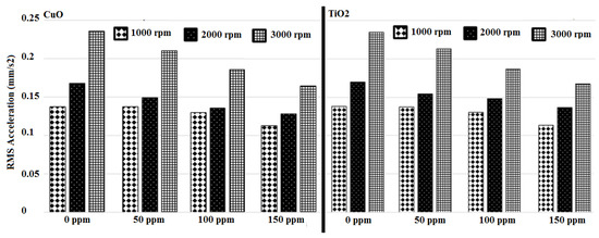 The root mean square (RMS) of engine vibration acceleration for 0 ppm nanoparticles was measured as 0.63, 0.16, and 0.23 m/s2 at 1000, 2000, and 3000 rpm, respectively. The RMS increased proportionally to the engine speed. However, the addition of CuO and TiO2 nanoparticles resulted in a reduction in the RMS. As the engine speed increased, the effects of the nanoparticles on reducing engine vibrations became more pronounced.