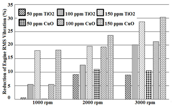 Figure 6. The reduction in the RMS of engine vibration acceleration compared between using pure fuel and CuO and TiO2.