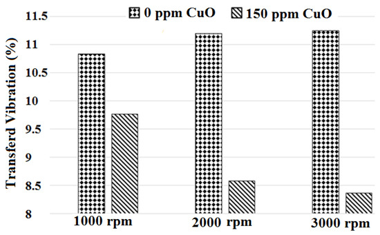 Figure 8 illustrates the percentage of vibrations transmitted from the engine to the steering wheel in different scenarios when using 0 ppm and 150 ppm of CuO nanoparticles. As depicted in Figure 8, when 0 ppm of CuO nanoparticles was used in the gasoline, the percentage of vibrations transmitted from the engine to the steering wheel increased with speed. The transmission rates were 10%, 11.19%, and 11.24% at 1000, 2000, and 3000 rpm, respectively.