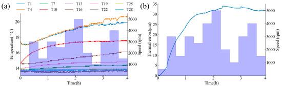 The measured data at variable speed 1. (a) Temperature data. (b) Thermal error data.