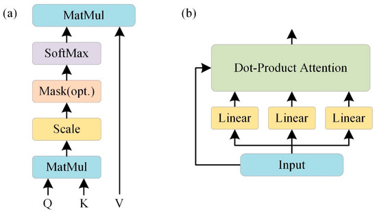 The self-attentive mechanism is a variant of the attention mechanism that is less dependent on external information and more adept at capturing the internal relevance of data or features [28]. The core of self-attention mechanism is dot-product attention. The calculation process of dot-product attention is shown in Figure 5, which is defined as follows: