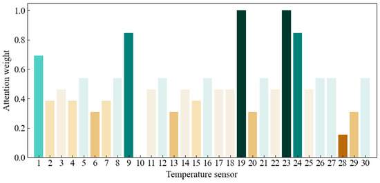 The attention weights of the temperature-sensitive points of the machine tool selected based on the self-attention mechanism are shown in Figure 7. An attention weight close to 0 means that the temperature sensor has no importance, while an attention weight close to 1 means that the temperature sensor has high importance. Sensor 19 and Sensor 23 have the highest attentional weight, which can reach 1. This is followed by Sensor 9 and Sensor 24, with an attentional weight of 0.846. The lowest attentional weight is Sensor 10, which is only 0.
