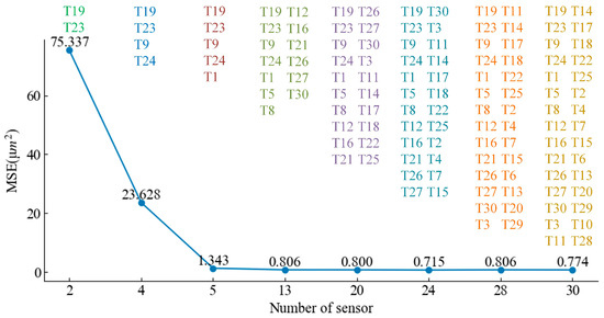 Even if temperature features with low attentional weights are eliminated, these temperature features still have redundancy and create problems in the high dimensional space. It is necessary to fuse multiple features into new feature data using attentional weights. The EasyTL model was used to train the prediction for 2000 rpm with mean squared error (MSE) as the evaluation metric. The least important features were iteratively eliminated based on the ranking of the feature attention weight. As can be seen in Figure 8, with the elimination of redundant features and measurement noise, the accuracy is about 0.8 until only 13 features remain. Then, the prediction accuracy decreases as important features are eliminated, resulting in the loss of useful information, and the MSE even reaches 75.34 µm2 at 2 features. By comparing the prediction accuracies of the model, a combination of 13 temperature feature fusions, i.e., T1, T5, T8, T9, T12, T16, T19, T21, T23, T24, T26, T27, and T30, were finally selected. The results of feature fusion are shown in Figure 9. The results show that this method helps to identify and eliminate redundant features and improves the performance of the model.